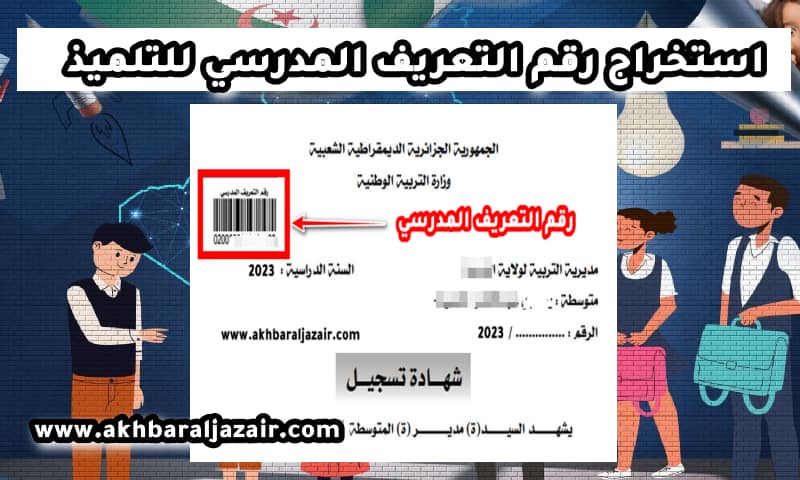 استخراج رقم التعريف المدرسي الوطني للتلميذ School identification number حتى تتمكن من استخراج كشف النقاط ومعرفة نتائج الامتحانات المدرسية. رقم التعريف المدرسي هو رقم خاص موحد لكل تلميذ يدرس بالمؤسسة التربوية العمومية حيث يستعمل في تسجيل تلميذ جديد في فضاء الأولياء للاطلاع على نتائج التلاميذ. وكذا الاستفادة من مختلف الخدمات التي يوفرها الموقع.