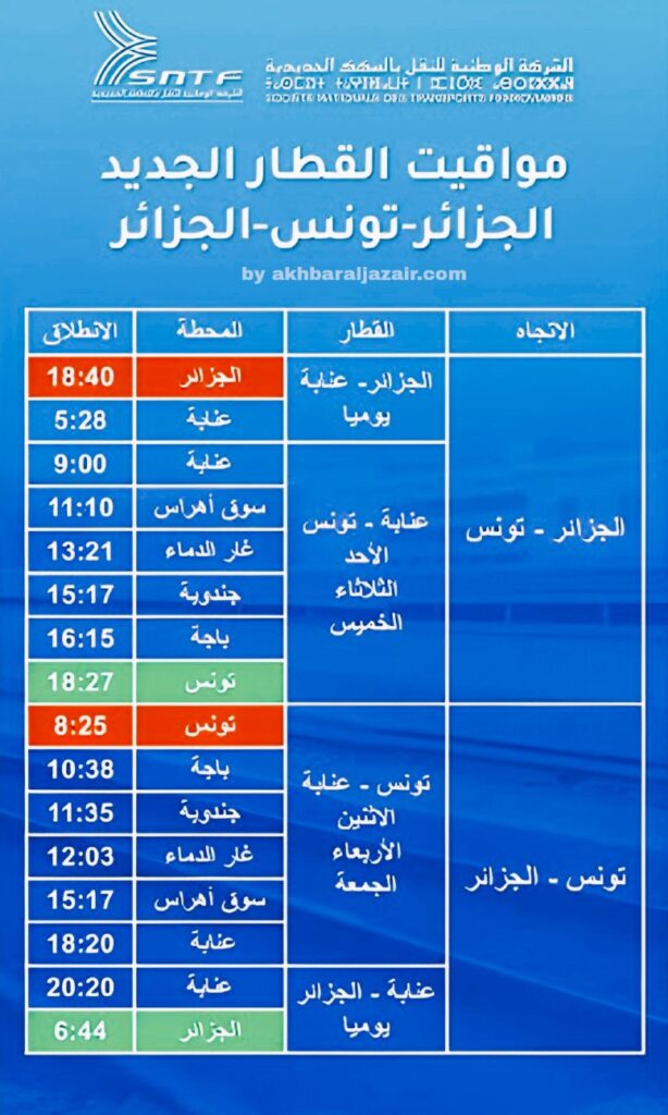 اليك جدول مواقيت واسعار تذاكر القطار الجديد الجزائر – تونس – الجزائر